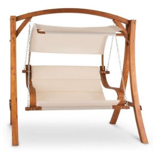 Esta es otra opción muy apetecible de la marca Blumfeldt, con una estructura de columpio que le aporta un giro muy ergonómico al asiento. Sus reposabrazos son de madera y siguen el movimiento del brazo, por lo que son muy cómodo para el apoyo, y la estructura de estos sigue hasta arriba, donde se sitúa el toldo. Esto es muy cómodo, porque la protección para el sol imita el movimiento del columpio, asegurándote de que no quedas expuesto en ningún momento ya que la sombra te acompaña en todo momento. Confortable y relajante, este columpio aporta seguridad gracias a la robustez de su estructura, fabricada en madera, y aunque pueden caber dos personas está pensada para una, ya que de ese modo se dispone de más espacio y resulta más cómodo. Le da una apariencia rústica y elegante a un jardín, y, además, es un elemento perfecto para pasar horas leyendo o escuchando música. Recomendación asegurada.